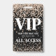 Badge d'événement VIP Gold Parties scintillant. Cet élégant badge événementiel est parfait pour une variété de célébrations, y compris des soirées Sweet 16, des Bat mitzvah, des fêtes du Nouvel An, et plus encore. Le design se compose d'un arrière - plan noir avec un dégradé de parties scintillant de confettis doré en haut et en bas, créant un look festif et glamour. La même conception est imprimée sur les deux côtés pour plus de cohérence. Le badge comprend des polices serif en gras mélangées avec de la typographie simple, permettant l'espace pour le nom de l'événement, la date et "All Access Pass". Vous pouvez customiser le texte et même changer la couleur de l’arrière - plan pour correspondre au thème de votre événement. Ce badge ajoute une touche de sophistication et donne à vos invités une sensation particulière !
