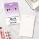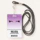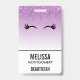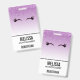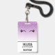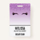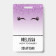 Insigne de nom avec un design design tendance et élégant. L'arrière - plan est un dégradé violet avec une image de fausse parties scintillant scintillante qui descend du haut. Une paire de cils mignons ceinturés sous l'image de la parties scintillant.