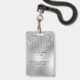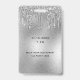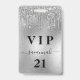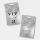 Un badge moderne, élégant et glamour pour une fête d'anniversaire de 21 ans (ou tout âge). Un fond métallisé de couleur argent faux avec un effet de gouttes de peinture et de paillettes. Personnalisez et ajoutez un nom et un âge sur le devant. Le nom est écrit avec une police de caractères manuscrite moderne avec des fioritures. Avec le texte : VIP et Numéro 21. Pour conserver les fioritures, supprimez simplement le nom d'exemple, laissez les espaces ou émojis avant et après le nom.