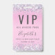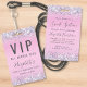 Une invitation unique pour une fête d'anniversaire pour les 16 ans qui sert également de badge pour les invités à porter lors de la fête et à garder en souvenir. Ce joli design présente des bordures de faux confettis holographiques violets, roses et argentés sur fond rose, son nom dans un script tendance gris doux et "Passe d'accès VIP" en haut. Au verso, personnalisez l'invitation à la fête d'anniversaire.