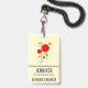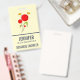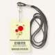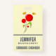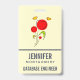 Nom tag avec un dessin charmant de plusieurs fleurs rouges fantaisistes avec le coeur gras attaché à une tige verte. 2 papillons jaunes planent à proximité. Dessiné avec un contour noir. Design fantasque et mignon.