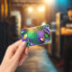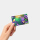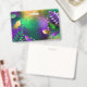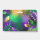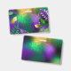 Fond texturé iridescent de mardi gras avec des taches de violet, jaune et vert, décoré de plumes douces et de perles brillantes. Vacances de mardi gras.