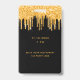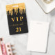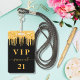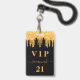Un badge moderne, élégant et glamour pour une fête d'anniversaire de 21 ans (ou tout âge). Un fond noir avec un effet de gouttes de paillettes dorées, aspect peinture qui coule. Le nom est écrit avec un style de lettrage manuscrit moderne avec des fioritures. Avec le texte : VIP Le numéro 21 est écrit en couleur dorée. Pour conserver les fioritures, supprimez simplement le nom de l'exemple, laissez les espaces ou les émojis devant et derrière le nom.