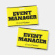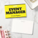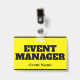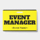 Ce design de badge accrocheur comporte le message "GESTIONNAIRE D'ÉVÉNEMENT". Un badge comme celui-ci pourrait peut-être être utilisé pour identifier que le porteur est un officiel lors d'un événement. [~Z0000307]