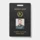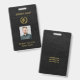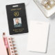 badge photo de l'employé du salon de coiffure d'identification personnalisée sur un élégant arrière - plan en cuir noir avec ciseaux en faux or et logo de couronne de laurier et script de typographie. ++++++++++++ Facile à personnaliser avec votre nom d'entreprise, logo, photo de l'employé, nom et titre et votre texte à l'arrière. +++++++++++++++++++ Convient pour salon de coiffure élégant pour hommes barbier, magasin pour hommes ou toute autre entreprise professionnelle élégante exclusive.