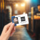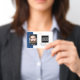 badge d'identification de bureau intelligent avec un arrière - plan bleu et blanc, une photo de l'employé, le logo de votre entreprise, le nom et la profession.