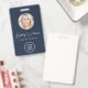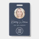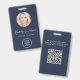 Badge d'identification bleu professionnel comportant la photo de votre employé dans un cadre circulaire, leur nom dans un script blanc chic, leur titre en lettrage blanc propre et le logo de votre entreprise ou organisation. Au verso, ajoutez toute information supplémentaire et un code QR facultatif. Le code QR est généré automatiquement par Zazzle à partir de l'adresse du site Web que vous fournissez.