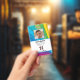 badge d'identification du personnel de l'entreprise avec des modèles créés pour vous. Arrière - plan est un abstrait moderne dans un motif arc-en-ciel solaire.