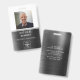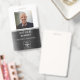 Carte d'identité photo de l'employé en métal noir blanc moderne personnalisée. Personnalisez ce badge de carte d'identité d'entreprise avec le nom, la position, la photo et le logo de votre entreprise sur le côté avant et votre texte d'information personnalisé sur le côté arrière. La photo de l'employé fonctionne le mieux en format carré. Votre logo fonctionne le mieux comme un format carré png avec arrière - plan transparent. Le logo réservé que vous voyez sur le badge sera complètement remplacé par votre propre logo.