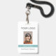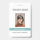 Le badge d'identification photo de l'employé de style d'entreprise, avec un design simple. Le logo de votre entreprise est en haut, votre photo ou code QR est au milieu et ci-dessous est votre nom sur une bande de couleur turquoise / turquoise avec votre titre en bas. Le verso comporte un champ modèle pour le texte facultatif, tel que vos coordonnées professionnelles. Les couleurs de la bande et du texte peuvent être modifiées dans l'outil d'édition de conception.