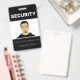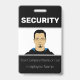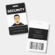 Ce badge d'identification photo personnalisé comporte un échantillon de photo dans le centre. Le titre "SÉCURITÉ" est imprimé au-dessus de celui-ci en caractères blancs gras sur un arrière - plan noir. Vous pouvez inclure le nom de votre entreprise ou le texte d'ajout sous l'image, ainsi qu'un nom d'employé. L'arrière du badge contient des informations supplémentaires sur l'employé ou l'entreprise imprimées sur un arrière - plan noir, avec un exemple de code à barres placé en bas. Vous pouvez remplacer le code d'analyse par votre propre image, ou une autre image, comme un logo personnalisé.