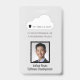 Badge d'identification d'employé vertical avec fond gris clair et photo encadrée de l'employé. Tous les éléments sont modifiables ou amovibles. Les éléments de la face avant du badge comprennent : le logo de l'entreprise, le slogan de l'entreprise, la photo de l'employé, le nom de l'employé, le département de l'employé. Le verso du badge comporte les informations sur l'entreprise, les instructions "en cas de perte" pour le retour à l'entreprise, et un code-barres de sécurité, tout cela étant personnalisable. Également disponible en orientation horizontale. Fente en haut pour un cordon. Tous ces éléments peuvent être modifiés ou supprimés.