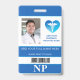 Infirmière praticienne (ou autre, car vous pouvez modifier les initiales et la description en utilisant les zones de texte fournies) badge d'identification médicale vertical avec section de code-barres. Même conception sans code-barres également disponible. Conception en bleu et blanc avec détails aqua. Initiales NP en texte blanc sur la section bleue inférieure. Zone pour la photo d'identité avec possibilité d'ajouter des images en portrait ou en paysage. Cœur bleu et aqua avec logo médical héraldique, qui peut être conservé tel quel ou modifié pour ajouter votre propre logo d'entreprise en changeant facilement l'image sur le modèle. Zone pour le nom complet, titre de poste, hôpital ou nom de l'entreprise. Dos en bleu avec informations au cas où la carte d'identité est perdue. À tout le personnel médical dans les lignes, MERCI POUR VOTRE SERVICE INCROYABLE !