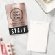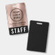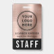 Badge d'identification moderne pour le personnel professionnel, l'employé ou l'équipe de votre entreprise, événement, conférence ou convention avec le logo de votre entreprise ou organisation sur un fond métallique faux brossé rose or (remplacez ce fond par votre propre image si vous le souhaitez). Ajoutez un nom et un titre de poste ou l'événement et la date.