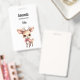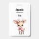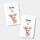 Étiquette nominative avec une illustration d'un adorable faon. Grands yeux grandes oreilles avec une grosse tête et de petites bois bruns. Porte un grand nœud rouge.