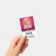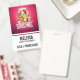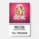Insigne de nom avec un design graphique de Noël lumineux et festif. Le texte dit Joyeux Noël & Bonne Année. Conçu avec un monticule de cadeaux en forme d'arbre avec des flocons de neige festifs, des étoiles, des baubles de noël et des étincelles à l'air brillant. Aiguilles de pin et illustration en forme d'arbre également inclus dans cette image de vacances. L'arrière - plan est une couleur rose rougeâtre vibrante.