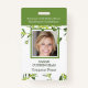 Insigne avec photo, nom et nom de la société. Arrière - plan de feuillage vert.