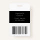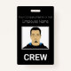 Ce badge d'identification photo personnalisé comporte un échantillon de photographie au centre. Le titre "ÉQUIPAGE" est imprimé en caractères gras blancs sur un arrière - plan noir pour désigner l'individu comme membre d'équipage pour votre événement. Vous pouvez inclure le nom de votre société ou du texte supplémentaire au-dessus de l'image, ainsi qu'un nom d'employé. L'arrière du badge contient des renseignements supplémentaires sur l'employé ou l'entreprise imprimés sur un arrière - plan noir, avec un exemple de code à barres placé en bas. Vous pouvez remplacer le code de numérisation par le vôtre ou une autre image, comme un logo personnalisé.