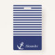 L'insigne rayé de bleu marine et blanc peut être personnalisé avec votre nom. Une ancre blanche est près de votre nom. Au-dessus du nom sont les rayures horizontales de bleu marine et blanches.