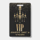 Le badge d'accessoire de la fête Chic Sweet 16 ou Quinceañera est réalisé en noir avec des graphismes d'un faux lustre de parties scintillant d'or, et une parties scintillant d'apparence or sur le dessus. Le texte graphique en parties scintillant dorée lit VIP.Le texte personnalisé, en bas, est prêt à être personnalisé pour le grand jour de votre fille.