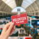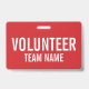 Red Volunteer Badgefeaturing title and team name in white bold sans serif font sur arrière - plan rouge.