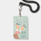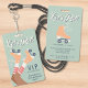 Invitation amusante de couleur vert sauge pour une fête d'anniversaire de roller avec badge VIP "Accès illimité" et cadeau de fête pour tout âge, avec la phrase "C'est parti !" en écriture blanche, une illustration rétro de patins à roulettes orange clair sur une fille à peau foncée portant des chaussettes rayées rose et une typographie moderne bleu sarcelle. Le recto sert de badge que les filles peuvent porter pendant la fête. Ajoutez les détails de l'invitation au verso.