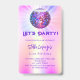 Une invitation à la fête féminine et féminine 21e (ou tout âge). Un arrière - plan de couleur holographique en violet, rose, jaune, bleu. Décoré d'une boule de disco colorée. Texte : Faisons la fête ! Personnalisez et ajoutez un nom et des détails du parti. Le nom est écrit avec un script de style écrit à la main, des lettres de couleur violette. Dos : pas de design ni de couleur (moins cher)