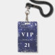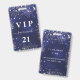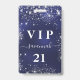 Un badge moderne, élégant et glamour pour une fête d'anniversaire du 21e (ou tout âge). Fond bleu marine avec poussière de strass argenté. La couleur de fond bleu est inégale. Personnalisez et ajoutez un nom. Le nom est écrit avec un style de lettrage manuscrit moderne avec fioritures. Le texte : VIP Numéro 21. Pour garder les fioritures, supprimez simplement le nom de l'exemple, laissez les espaces ou émojis devant et derrière le nom.