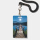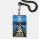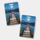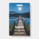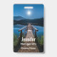 Un badge avec une belle photographie d'une jetée en bois s'avançant au-dessus d'un lac calme.