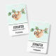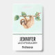 Nom badge avec une adorable paresse accrochée à l'envers d'une branche d'arbre. La branche d'arbre est décorée de feuilles tropicaux et de baies. Placez-vous sur un arrière - plan vert clair.