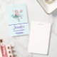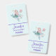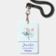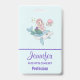 Badge nominatif avec une illustration adorable. Conçu avec une jolie fille sirène chevauchant un dauphin heureux. Un petit ami méduse les accompagne. Décoré avec de petites éclaboussures de paillettes dorées fausses. Fond bleu clair avec des pois roses délavés.