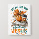 Design paisible et coloré avec une scène automne / automne avec un livre ouvert, citrouille et café. Le texte inspirant et coloré dit : "Laissez-moi vous parler de mon Jésus". Ce design est disponible sur une grande variété de produits.