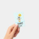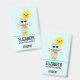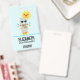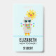 Badge avec un lama à l'air cool portant des lunettes de soleil noires. Vêtu d'une écharpe rayée colorée et de petites bottes amusantes. Un soleil jaune vif avec un visage kawaii heureux en arrière-plan. Des triangles colorés fantaisistes entourent ce lama qui aime s'amuser. Fond bleu.