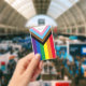 Lgbtq arc-en-ciel inclusif diversité drapeau gay pride vertical badge recto verso. Fierté lgbt lgbtq diversité inclusive trans progrès gay rainbow flag