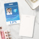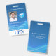 Licence verticale Infirmière pratique (ou autre que vous pouvez modifier les initiales et la description de travail en utilisant les zones de texte fournies) Badge d'ID photo. Conception avec arrière - plan bleu avec conception ondulante de la lumière d'onde - rendant la conception difficile à reproduire par les imposteurs - Gardez notre logo médical de coeur bleu et turquoise ou ajoutez facilement votre propre logo de l'entreprise en utilisant notre image modèle. Initiales LPN en bas en bleu sur blanc rectangulaire stripe NOTE : si vous utilisez un SYSTÈME BUDDY : le texte rectangle blanc et les initiales peuvent être changés en n'importe quelle autre couleur que vous voulez en sélectionnant personnaliser plus loin. ID avec photo, nom, nom de l'entreprise/hôpital et numéro d'identification. Retour avec la zone pour l'information dans le badge coque se perd. Aussi disponible en présentation horizontale.À tout le personnel Médicale dans les lignes, MERCI POUR VOTRE SERVICE EXTRAORDINAIRE!