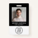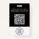 Un badge de nom d'employé noir moderne et professionnel portant sa photo, son nom et son titre, ainsi que le logo de votre entreprise ou de votre organisation. Au contraire, ajoutez des informations supplémentaires ; entrez une adresse URL du site Web pour créer un code QR numérisable.