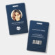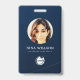 Carte d'identité professionnelle photo moderne avec code-barres sur fond bleu foncé. Des informations supplémentaires peuvent être ajoutées au verso de ce badge d'identification professionnelle