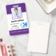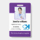 Créez vos propres étiquettes et badges de nom d'employé personnalisés à l'aide d'un élégant modèle vertical et moderne qui est facile d'ajouter votre propre photo, le logo de l'entreprise, le code à barres et d'autres informations importantes. Un design d'entreprise simple en violet et blanc & nom et titre avec code à barres. Pas de commande minimum.