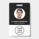 Un badge d'identification d'employé noir moderne et professionnel portant sa photo dans un cadre circulaire, son nom et son titre, ainsi que le logo de votre entreprise ou de votre organisation. Au verso, ajoutez des informations supplémentaires et du code QR facultatif.