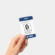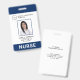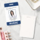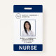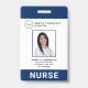 badge d'identification photo Médicale dans une disposition verticale. Ce design simple mais professionnel est doté d'une bordure bleu marine en haut et en bas avec du blanc au milieu. Le modèle est personnalisé avec votre logo, le nom de l'hôpital, le nom de l'employé, le titre, le département/lieu et l'ID de l'employé. La bordure inférieure a "NURSE" en gros caractères gras et peut être changée en n'importe quel titre désiré. Le côté arrière contient vos coordonnées et les instructions pour le retour si trouvé. Ce design classique est parfait pour une infirmière pratique autorisée, une infirmière de voyage et de nombreux autres membres du personnel médical.