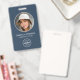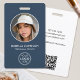 Faites bonne impression avec un badge d'identification élégant et professionnel. Ce modèle recto-verso présente votre photo d'identité dans un cercle et est personnalisé avec un nom, un logo, des coordonnées et un code QR scannable. Personnalisez le texte pour qu'il corresponde à votre marque. Ce design moderne convient à de nombreux lieux de travail et professions différents, notamment les professionnels du monde des affaires, les vendeurs au détail, les consultants en beauté, le personnel hôtelier, les petites entreprises, les badges de conférence, etc. ! Couleurs imprimées : bleu ardoise, noir et blanc.