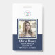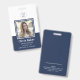 Ce badge vertical bleu marine minimaliste peut être personnalisé avec les photos et les noms de vos employés. Vous pouvez également ajouter du texte personnalisé pour le numéro d'identification de l'employé, le titre, l'emplacement et plus encore. Votre logo peut être inséré en haut du design.