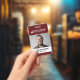 Un badge d'identification employé moderne. Le design comprend votre logo d'entreprise, votre nom d'entreprise et votre ligne d'étiquettes. Il montre une photo d'identité d'employé de grande taille. Les informations peuvent être personnalisées et comprennent le nom de l'employé, le titre de l'emploi et le numéro d'identification de l'insigne. Le dos de l'insigne d'identification montre le logo et le nom de l'entreprise. Couleur : Rouge foncé