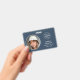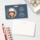 Impressionnez avec un badge d'identification élégant et professionnel. Ce modèle recto verso présente votre photo d'identité en cercle et est personnalisé avec un nom, un logo, des coordonnées et un code QR scannable. Customisez le texte correspondant à votre marque. Ce design moderne conviendra à de nombreux lieux de travail et professions différents, y compris les professionnels d'entreprise, les vendeurs au détail, les consultants en beauté, le personnel de l'hôtel, les petites entreprises, les étiquettes de nom de conférence et plus encore! Couleurs imprimées : ardoise bleu, noir et blanc.