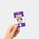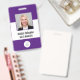 Ce badge présente un arrière - plan simple, moderne, violet et blanc pour un look professionnel. Customisez-le avec votre photo carré, nom, titre de travail, logo, nom de l'entreprise, adresse ou autres informations, et code à barres en option.