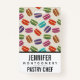 Nom badge avec un mignon motif de macarons dans de nombreuses couleurs différentes avec un faible motif de pois derrière.