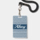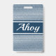 Conception de texte Ahoy avec décoration de bandes navales bleues et blanches