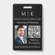 Insigne de nom minimaliste moderne avec photo. Noir & Blanc ou choisissez vos couleurs personnalisées. Ajoutez votre site Web ou votre adresse Web de médias sociaux au QR Scan Code. Parfait pour les petites entreprises, les marques d'entreprise, les indépendants, les salons de beauté, les spas, les traiteurs, les boulangeries, cafés, restaurants et plus encore. Facile à personnaliser avec vos initiales monographiques, nom et information d'entreprise, titre de poste, slogan, photo d'employé ou même ajouter votre logo ou votre marque personnelle.