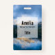 Nom badge avec une belle photo nature. Montagnes dans l'arrière - plan avec un lac calme encore au premier plan. Photo sereine et relaxante.