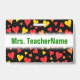 Ce design amusant de badge est composé d'un motif aux formes cardiaques de différentes tailles et aux couleurs colorées comme le rouge, l'orange et le jaune. On pourrait dire que les formes du coeur flottent. Il comporte également un nom personnalisé en texte vert dans une zone de couleur blanche. Un badge comme celui-ci pourrait peut-être être porté par un enseignant, un éducateur, un tuteur ou un professeur pendant les premières semaines d'une année scolaire ou d'un cours. Cela pourrait aider les élèves à apprendre et à se souvenir du nom de leur professeur. [~Z0000175]